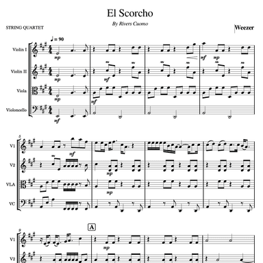 String Trio Cello,Viola,Violin - Level 3 - Digital Download SKU: A0.515877 By Weezer. By Rivers Cuomo. Arranged by Eve C. Mailly. Pop,Rock. 16 pages. Zene Strings #6052705. Published by Zene Strings (A0.515877). El Scorcho is a catchy little song by Weezer that is arranged here for string trio. As with all of our string trio arrangements, the middle part is included in both treble and alto clef giving you the flexibility of playing it with either two violins and a cello, to a violin, viola and cello. From your friends at Zene Strings - enjoy!To see our other great arrangements visit: ZeneSheetMusic.com. Questions or comments? Email us at [email protected]. We're here to help! This product was created by a member of ArrangeMe, Hal Leonard's global self-publishing community of independent composers, arrangers, and songwriters. ArrangeMe allows for the publication of unique arrangements of popular titles and original compositions from a variety of voices and backgrounds. The length, difficulty, and retail pricing are determined solely by the discretion of the person who arranged or composed it. About Digital Downloads Digital Downloads are downloadable sheet music files that can be viewed directly on your computer, tablet or mobile device. Once you download your digital sheet music, you can view and print it at home, school, or anywhere you want to make music, and you don’t have to be connected to the internet. Just purchase, download and play! PLEASE NOTE: Your Digital Download will have a watermark at the bottom of each page that will include your name, purchase date and number of copies purchased. You are only authorized to print the number of copies that you have purchased. You may not digitally distribute or print more copies than purchased for use (i.e., you may not print or digitally distribute individual copies to friends or students).