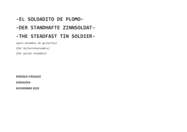 Small Ensemble Guitar - Level 1 - Digital Download SKU: A0.1014759 Composed by Enrique Vázquez. Children,Instructional. Score and parts. 12 pages. Enrique Vázquez #5018951. Published by Enrique Vázquez (A0.1014759). Un soldadito de plomo defectuoso y cojo, se enamora de una bailarina. Después de pasar por muchas desgracias; el diablo de la caja de sorpresa, de marinero por las alcantarillas, se lo come un pez...al final, gracias a su empeño y a su fuerza de voluntad, consigue estar unido a su bailarina, ya que, debido a una caída fortuita en el fuego de la chimenea de la casa, sus peanas se fundirán y se unirán para siempre formando un bonito corazón. (Texto: Hans C. Andersen)(uno puede ser capaz de conseguir lo que se proponga si pone el suficiente esfuerzo y empeño. ¡La música es el mejor esfuerzo y empeño que puede existir!)Individual parts available on request, contact: [email protected] This product was created by a member of ArrangeMe, Hal Leonard’s global self-publishing community of independent composers, arrangers, and songwriters. ArrangeMe allows for the publication of unique arrangements of both popular titles and original compositions from a wide variety of voices and backgrounds. About Digital Downloads Digital Downloads are downloadable sheet music files that can be viewed directly on your computer, tablet or mobile device. Once you download your digital sheet music, you can view and print it at home, school, or anywhere you want to make music, and you don’t have to be connected to the internet. Just purchase, download and play! PLEASE NOTE: Your Digital Download will have a watermark at the bottom of each page that will include your name, purchase date and number of copies purchased. You are only authorized to print the number of copies that you have purchased. You may not digitally distribute or print more copies than purchased for use (i.e., you may not print or digitally distribute individual copies to friends or students).