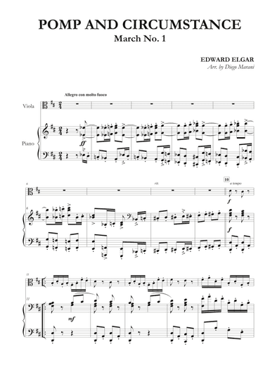 Viola Solo - Level 2 - Digital Download SKU: A0.1487409 Composed by Edward Elgar. Arranged by Benzaiten Editions. 19th Century,Instructional,March,Romantic Period,Wedding. Individual part. 1 pages. Benzaiten Editions #1064353. Published by Benzaiten Editions (A0.1487409). Hey there! Ready to dive into the majestic and stirring melody of "Pomp and Circumstance"? Let's create some musical magic together! Perfect for graduations and formal events, this song adds a touch of grandeur and tradition to any celebration. Let the powerful music carry you away on a journey of achievement and honor with this unforgettable classic. Elgar • Pomp and Circumstance | viola sheet music About the song | Elgar • Pomp and Circumstance "Pomp and Circumstance," composed by Sir Edward Elgar, is an iconic march that has become synonymous with graduation ceremonies worldwide. With its uplifting and ceremonial melody, this piece has inspired countless individuals as they mark significant milestones in their lives. Whether you're playing it solo or as part of a group, its majestic power and timeless appeal are sure to captivate your audience and leave a lasting impression. This product was created by a member of ArrangeMe, Hal Leonard’s global self-publishing community of independent composers, arrangers, and songwriters. ArrangeMe allows for the publication of unique arrangements of both popular titles and original compositions from a wide variety of voices and backgrounds. About Digital Downloads Digital Downloads are downloadable sheet music files that can be viewed directly on your computer, tablet or mobile device. Once you download your digital sheet music, you can view and print it at home, school, or anywhere you want to make music, and you don’t have to be connected to the internet. Just purchase, download and play! PLEASE NOTE: Your Digital Download will have a watermark at the bottom of each page that will include your name, purchase date and number of copies purchased. You are only authorized to print the number of copies that you have purchased. You may not digitally distribute or print more copies than purchased for use (i.e., you may not print or digitally distribute individual copies to friends or students).