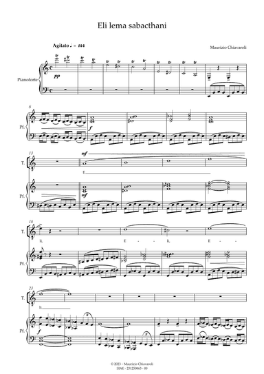 Choral Choir (SSA) - Level 4 - Digital Download SKU: A0.1179957 Composed by Maurizio Chiavaroli. Christian,Easter,Religious,Sacred. Octavo. 6 pages. Maurizio Chiavaroli #779894. Published by Maurizio Chiavaroli (A0.1179957). Composizione originale per Tenore solo, coro SSA e pianoforte estratta dall'opera sacra "Le 7 parole di Gesù in croce" di Maurizio Chiavaroli Originale composition for tenor voice, choir SSA and piano extracted from the sacred opera "Le 7 parole di Gesù in croce" by Maurizio Chiavaroli. This product was created by a member of ArrangeMe, Hal Leonard's global self-publishing community of independent composers, arrangers, and songwriters. ArrangeMe allows for the publication of unique arrangements of popular titles and original compositions from a variety of voices and backgrounds. The length, difficulty, and retail pricing are determined solely by the discretion of the person who arranged or composed it. About Digital Downloads Digital Downloads are downloadable sheet music files that can be viewed directly on your computer, tablet or mobile device. Once you download your digital sheet music, you can view and print it at home, school, or anywhere you want to make music, and you don’t have to be connected to the internet. Just purchase, download and play! PLEASE NOTE: Your Digital Download will have a watermark at the bottom of each page that will include your name, purchase date and number of copies purchased. You are only authorized to print the number of copies that you have purchased. You may not digitally distribute or print more copies than purchased for use (i.e., you may not print or digitally distribute individual copies to friends or students).