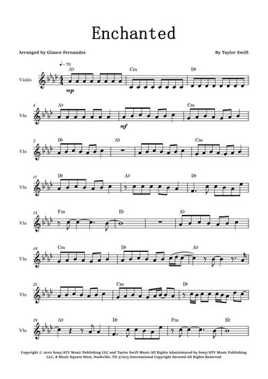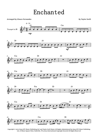 B-Flat Bass Saxophone,Instrumental Solo,Piano - Level 3 - Digital Download SKU: A0.1307313 By Taylor Swift. By Taylor Swift. Arranged by Glauco Fernandes. Chamber,Pop,Wedding. Score and individual part. 13 pages. Glauco Fernandes #896590. Published by Glauco Fernandes (A0.1307313). "Intermediate Arrangement Sheet Music for Bass Saxophone with Piano Accompaniment for Taylor Swift's 'Enchanted'Discover Taylor Swift's music in a whole new way! We present to you the sheet music for the intermediate arrangement of the song 'Enchanted,' specially adapted for bass saxophone with piano accompaniment.Highlights:Intermediate arrangement suitable for musicians looking to elevate their skills.Complete sheet music for bass saxophone with detailed notations.Piano accompaniment to add depth and emotion to your performance.Ideal for a variety of events, including weddings.This arrangement captures the magical essence of Taylor Swift's original music, allowing you to interpret it in a unique and engaging way. Whether for your personal musical pleasure or to impress your audience, this sheet music is the perfect choice.Get the sheet music now and start creating your own musical magic with 'Enchanted'!" This product was created by a member of ArrangeMe, Hal Leonard’s global self-publishing community of independent composers, arrangers, and songwriters. ArrangeMe allows for the publication of unique arrangements of both popular titles and original compositions from a wide variety of voices and backgrounds. About Digital Downloads Digital Downloads are downloadable sheet music files that can be viewed directly on your computer, tablet or mobile device. Once you download your digital sheet music, you can view and print it at home, school, or anywhere you want to make music, and you don’t have to be connected to the internet. Just purchase, download and play! PLEASE NOTE: Your Digital Download will have a watermark at the bottom of each page that will include your name, purchase date and number of copies purchased. You are only authorized to print the number of copies that you have purchased. You may not digitally distribute or print more copies than purchased for use (i.e., you may not print or digitally distribute individual copies to friends or students).