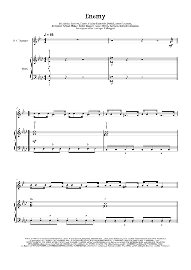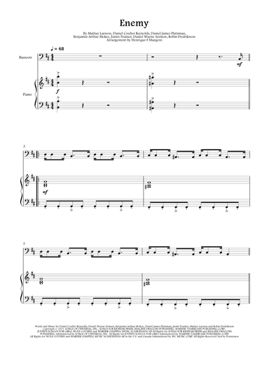 Double Bass,Piano,String Bass - Level 2 - Digital Download SKU: A0.1083160 By Imagine Dragons X Jid. By Benjamin Arthur Mckee, Daniel Coulter Reynolds, Daniel James Platzman, Daniel Wayne Sermon, Justin Tranter, Mattias Larsson, and Robin Fredriksson. Arranged by Henrique F Mangoni. Film/TV,Pop,Rock. Score and part. 5 pages. Henrique Franke Mangoni #687391. Published by Henrique Franke Mangoni (A0.1083160). Enemy by Imagine Dragons (B minor). Radio edit (without Jid). The Arcane opening song arranged for string bass and piano in the original key of B minor. Clean sheet music edition. Subscribe to my YouTube channel (Henrique F Mangoni) to know more about my work! enemy imagine dragons, imagine dragons enemy on piano, imagine dragons enemy piano sheet music, imagine dragons enemy piano easy, imagine dragons enemy chords, enemy imagine dragons arcane version, league of legends, imagine dragons enemy sheet music, enemy imagine dragons radio version, enemy imagine dragons radio edit, enemy imagine dragons solo version, imagine dragons enemy string bass, imagine dragons enemy string bass sheet music, enemy imagine dragons string bass, enemy imagine dragons string bass sheet music. This product was created by a member of ArrangeMe, Hal Leonard’s global self-publishing community of independent composers, arrangers, and songwriters. ArrangeMe allows for the publication of unique arrangements of both popular titles and original compositions from a wide variety of voices and backgrounds. About Digital Downloads Digital Downloads are downloadable sheet music files that can be viewed directly on your computer, tablet or mobile device. Once you download your digital sheet music, you can view and print it at home, school, or anywhere you want to make music, and you don’t have to be connected to the internet. Just purchase, download and play! PLEASE NOTE: Your Digital Download will have a watermark at the bottom of each page that will include your name, purchase date and number of copies purchased. You are only authorized to print the number of copies that you have purchased. You may not digitally distribute or print more copies than purchased for use (i.e., you may not print or digitally distribute individual copies to friends or students).