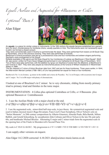Woodwind Ensemble,Woodwind Quartet Bassoon - Digital Download SKU: A0.912088 Composed by Alan Edgar. Concert,Contemporary. 3 pages. Alan Edgar Ted Moon #6569683. Published by Alan Edgar Ted Moon (A0.912088). 4 bassoons and optional 5th or contrabassoon OR 4 cellos and optional 5th cello or ‘bass.  Very short, very slow, very easy except that top part goes to Ab above the bass staff.  Suitable for funeral procession or religious service, memorial, solemn occasion, concert. This product was created by a member of ArrangeMe, Hal Leonard’s global self-publishing community of independent composers, arrangers, and songwriters. ArrangeMe allows for the publication of unique arrangements of both popular titles and original compositions from a wide variety of voices and backgrounds. About Digital Downloads Digital Downloads are downloadable sheet music files that can be viewed directly on your computer, tablet or mobile device. Once you download your digital sheet music, you can view and print it at home, school, or anywhere you want to make music, and you don’t have to be connected to the internet. Just purchase, download and play! PLEASE NOTE: Your Digital Download will have a watermark at the bottom of each page that will include your name, purchase date and number of copies purchased. You are only authorized to print the number of copies that you have purchased. You may not digitally distribute or print more copies than purchased for use (i.e., you may not print or digitally distribute individual copies to friends or students).