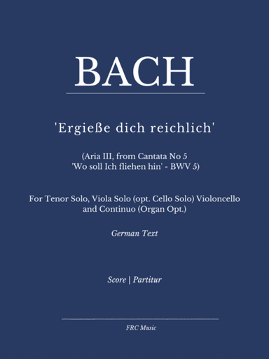 Small Ensemble Cello,Harpsichord,High Voice,Organ,Viola - Level 4 - Digital Download SKU: A0.597311 Composed by Johann Sebastian Bach. Arranged by Flavio Regis Cunha. Baroque,Concert,Sacred. Score and parts. 34 pages. Flavio Regis Cunha #5316631. Published by Flavio Regis Cunha (A0.597311). Wo soll ich fliehen hin (BWV 5) (Where will I escape to?) Is a cantata by Johann Sebastian Bach. It was written in Leipzig for the nineteenth Sunday after a Christian holiday, and was performed for the first time on October 15, 1724. The work was based on a choir of the same name by Johann Heermann. The piece was written for two oboes, the tromba da tirarsi, strings (violins, violas and bass), vocal and choral solo. This is the Ária: "Ergieße dich reichlich" (E Major). This product was created by a member of ArrangeMe, Hal Leonard's global self-publishing community of independent composers, arrangers, and songwriters. ArrangeMe allows for the publication of unique arrangements of popular titles and original compositions from a variety of voices and backgrounds. The length, difficulty, and retail pricing are determined solely by the discretion of the person who arranged or composed it. About Digital Downloads Digital Downloads are downloadable sheet music files that can be viewed directly on your computer, tablet or mobile device. Once you download your digital sheet music, you can view and print it at home, school, or anywhere you want to make music, and you don’t have to be connected to the internet. Just purchase, download and play! PLEASE NOTE: Your Digital Download will have a watermark at the bottom of each page that will include your name, purchase date and number of copies purchased. You are only authorized to print the number of copies that you have purchased. You may not digitally distribute or print more copies than purchased for use (i.e., you may not print or digitally distribute individual copies to friends or students).