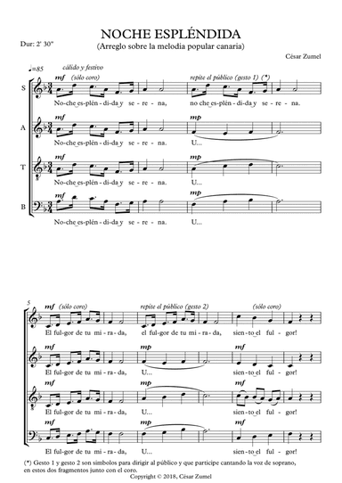 Small Ensemble - Level 2 - Digital Download SKU: A0.827834 Arranged by Miguel Astor. Christmas,Romantic Period,World. Score and parts. 4 pages. Miguel Astor #3639405. Published by Miguel Astor (A0.827834). "Espléndida Noche" Venezuelan Christmas Carol by Ricardo Pérez (XIXth century) arranged for SATB chorus by venezuelan composer Miguel Astor. This product was created by a member of ArrangeMe, Hal Leonard’s global self-publishing community of independent composers, arrangers, and songwriters. ArrangeMe allows for the publication of unique arrangements of both popular titles and original compositions from a wide variety of voices and backgrounds. About Digital Downloads Digital Downloads are downloadable sheet music files that can be viewed directly on your computer, tablet or mobile device. Once you download your digital sheet music, you can view and print it at home, school, or anywhere you want to make music, and you don’t have to be connected to the internet. Just purchase, download and play! PLEASE NOTE: Your Digital Download will have a watermark at the bottom of each page that will include your name, purchase date and number of copies purchased. You are only authorized to print the number of copies that you have purchased. You may not digitally distribute or print more copies than purchased for use (i.e., you may not print or digitally distribute individual copies to friends or students).