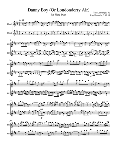 Flute Solo - Level 3 - Digital Download SKU: A0.757346 Composed by Traditional. Arranged by Ray Kamada. Holiday,Instructional,World. Individual part. 6 pages. The Lone Arranger #4320743. Published by The Lone Arranger (A0.757346). The familiar Danny Boy theme is woven through a set of variations rendered as a study in breath control and counting, employing harmonies consisting of quarter notes, eighths, sixteenths, and eighth note triplets, along with some 2 on 3 and 3 on 4 accompaniment. The flutes also switch lines in mid-stream and back again. The etude can be played either from the score or from separate parts. It can also be played for sheer enjoyment, gigs, or as a sight-reading exercise for teachers with more advanced students. This product was created by a member of ArrangeMe, Hal Leonard's global self-publishing community of independent composers, arrangers, and songwriters. ArrangeMe allows for the publication of unique arrangements of popular titles and original compositions from a variety of voices and backgrounds. The length, difficulty, and retail pricing are determined solely by the discretion of the person who arranged or composed it. About Digital Downloads Digital Downloads are downloadable sheet music files that can be viewed directly on your computer, tablet or mobile device. Once you download your digital sheet music, you can view and print it at home, school, or anywhere you want to make music, and you don’t have to be connected to the internet. Just purchase, download and play! PLEASE NOTE: Your Digital Download will have a watermark at the bottom of each page that will include your name, purchase date and number of copies purchased. You are only authorized to print the number of copies that you have purchased. You may not digitally distribute or print more copies than purchased for use (i.e., you may not print or digitally distribute individual copies to friends or students).