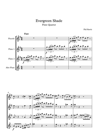 Flute Quartet,Woodwind Ensemble Alto Flute,Piccolo - Level 4 - Digital Download SKU: A0.1307689 Composed by Phil Rawle. Chamber,Contemporary,Jazz. 10 pages. Phillip Rawle #896951. Published by Phillip Rawle (A0.1307689). A new piece for Flute Quartet (Piccolo, Flute 1, Flute 2, Alto Flute). A short, fast work with jazz overtones and modern harmonies. This product was created by a member of ArrangeMe, Hal Leonard's global self-publishing community of independent composers, arrangers, and songwriters. ArrangeMe allows for the publication of unique arrangements of popular titles and original compositions from a variety of voices and backgrounds. The length, difficulty, and retail pricing are determined solely by the discretion of the person who arranged or composed it. About Digital Downloads Digital Downloads are downloadable sheet music files that can be viewed directly on your computer, tablet or mobile device. Once you download your digital sheet music, you can view and print it at home, school, or anywhere you want to make music, and you don’t have to be connected to the internet. Just purchase, download and play! PLEASE NOTE: Your Digital Download will have a watermark at the bottom of each page that will include your name, purchase date and number of copies purchased. You are only authorized to print the number of copies that you have purchased. You may not digitally distribute or print more copies than purchased for use (i.e., you may not print or digitally distribute individual copies to friends or students).