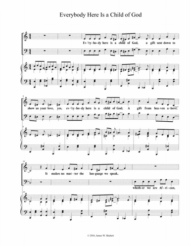 Choral Choir (Mixed) - Level 1 - Digital Download SKU: A0.971276 Composed by James Shubert. Christian,Praise & Worship,Sacred. Octavo. 4 pages. James W. Shubert #6082343. Published by James W. Shubert (A0.971276). 2 part Hymn (SA/TB) with piano accompaniment.  Easy level.  An up-beat examination of the Brother & Sisterhood of Humanity. This product was created by a member of ArrangeMe, Hal Leonard’s global self-publishing community of independent composers, arrangers, and songwriters. ArrangeMe allows for the publication of unique arrangements of both popular titles and original compositions from a wide variety of voices and backgrounds. About Digital Downloads Digital Downloads are downloadable sheet music files that can be viewed directly on your computer, tablet or mobile device. Once you download your digital sheet music, you can view and print it at home, school, or anywhere you want to make music, and you don’t have to be connected to the internet. Just purchase, download and play! PLEASE NOTE: Your Digital Download will have a watermark at the bottom of each page that will include your name, purchase date and number of copies purchased. You are only authorized to print the number of copies that you have purchased. You may not digitally distribute or print more copies than purchased for use (i.e., you may not print or digitally distribute individual copies to friends or students).