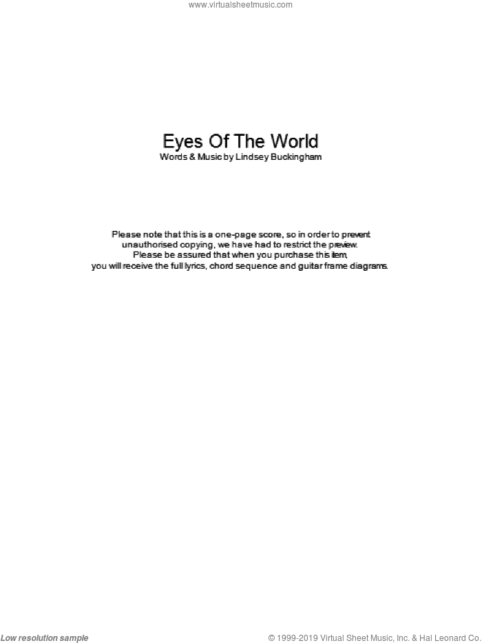 Digital sheet music for guitar (chords)NOTE: guitar chords only, lyrics and melody may be included (please, check the first page above before to buy this item to see what's included)Publisher: Hal LeonardContributors to this music title:Lindsey Buckingham (composer)This item includes: PDF (digital sheet music to download and print)Instrumentation:guitar (chords)Skill Level:intermediateGenre:rockPages:2