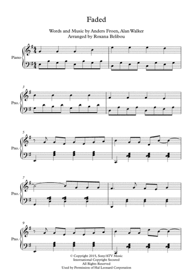 Piano,Vocal,Voice - Level 2 - Digital Download SKU: A0.575122 By Alan Walker. By Alan Walker, Anders Froen, Gunnar Greve, and Jesper Borgen. Arranged by Cadenza Editions. Contemporary. Score. 4 pages. Cadenza Editions #6109179. Published by Cadenza Editions (A0.575122). Alan Walker - Faded (Easy Piano). This product was created by a member of ArrangeMe, Hal Leonard’s global self-publishing community of independent composers, arrangers, and songwriters. ArrangeMe allows for the publication of unique arrangements of both popular titles and original compositions from a wide variety of voices and backgrounds. About Digital Downloads Digital Downloads are downloadable sheet music files that can be viewed directly on your computer, tablet or mobile device. Once you download your digital sheet music, you can view and print it at home, school, or anywhere you want to make music, and you don’t have to be connected to the internet. Just purchase, download and play! PLEASE NOTE: Your Digital Download will have a watermark at the bottom of each page that will include your name, purchase date and number of copies purchased. You are only authorized to print the number of copies that you have purchased. You may not digitally distribute or print more copies than purchased for use (i.e., you may not print or digitally distribute individual copies to friends or students).