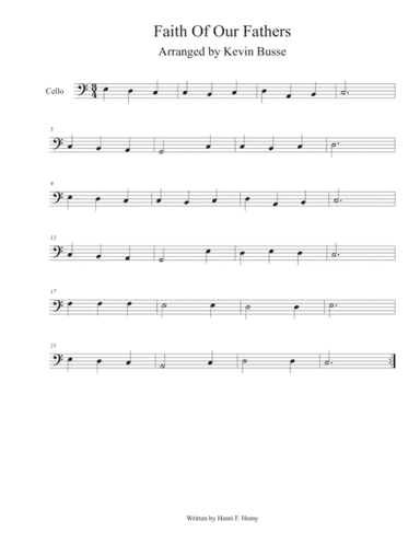 Cello,Piano - Level 3 - Digital Download SKU: A0.786634 Composed by Frederick William Faber, Henri F. Hemy, and J. G. Walton. Arranged by Beka Wilson. Christian,Holiday,Patriotic,Sacred. Score and part. 6 pages. Beka Wilson #6329163. Published by Beka Wilson (A0.786634). This is an intermediate-level arrangement of a beloved hymn--perfect for a church offertory or prelude. It could also be an occasion song for Father's Day, Independence Day, Memorial Day, or Veterans Day. This arrangement is available as a solo for voice, piano, flute, oboe, clarinet, bassoon, alto sax, tenor sax, F horn, trumpet, trombone, violin, viola, and cello. It is also available for SATB choir.Length: 3-3.5 minutesLevel: intermediate for most instruments6 pages (includes score and separate solo part)Want this arrangement in a different key or for a different set of instruments? Shoot me an email at [email protected] for a custom version of this arrangement that I can post on Sheet Music Plus for you. This product was created by a member of ArrangeMe, Hal Leonard's global self-publishing community of independent composers, arrangers, and songwriters. ArrangeMe allows for the publication of unique arrangements of popular titles and original compositions from a variety of voices and backgrounds. The length, difficulty, and retail pricing are determined solely by the discretion of the person who arranged or composed it. About Digital Downloads Digital Downloads are downloadable sheet music files that can be viewed directly on your computer, tablet or mobile device. Once you download your digital sheet music, you can view and print it at home, school, or anywhere you want to make music, and you don’t have to be connected to the internet. Just purchase, download and play! PLEASE NOTE: Your Digital Download will have a watermark at the bottom of each page that will include your name, purchase date and number of copies purchased. You are only authorized to print the number of copies that you have purchased. You may not digitally distribute or print more copies than purchased for use (i.e., you may not print or digitally distribute individual copies to friends or students).