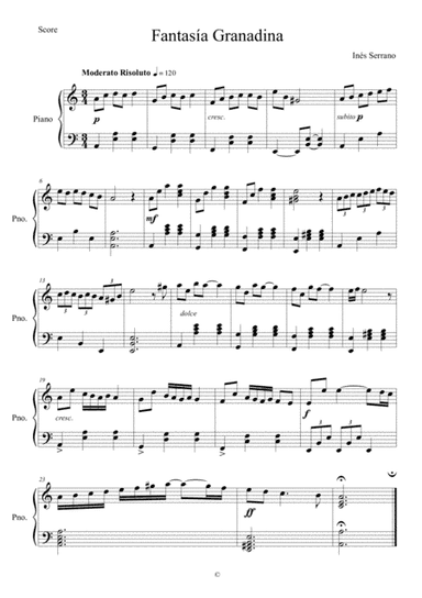 Piano Solo - Level 3 - Digital Download SKU: A0.1029828 Composed by Ines Serrano. Standards. Score. 1 pages. Ines Serrano #5740981. Published by Ines Serrano (A0.1029828). This product was created by a member of ArrangeMe, Hal Leonard's global self-publishing community of independent composers, arrangers, and songwriters. ArrangeMe allows for the publication of unique arrangements of popular titles and original compositions from a variety of voices and backgrounds. The length, difficulty, and retail pricing are determined solely by the discretion of the person who arranged or composed it. About Digital Downloads Digital Downloads are downloadable sheet music files that can be viewed directly on your computer, tablet or mobile device. Once you download your digital sheet music, you can view and print it at home, school, or anywhere you want to make music, and you don’t have to be connected to the internet. Just purchase, download and play! PLEASE NOTE: Your Digital Download will have a watermark at the bottom of each page that will include your name, purchase date and number of copies purchased. You are only authorized to print the number of copies that you have purchased. You may not digitally distribute or print more copies than purchased for use (i.e., you may not print or digitally distribute individual copies to friends or students).