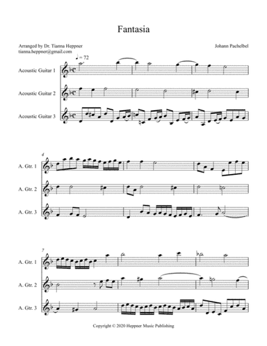 Small Ensemble Guitar - Digital Download SKU: A0.795594 Composed by Johann Pachelbel. Arranged by Dr. Tianna Heppner. Baroque,Classical,Contest,Festival,Instructional,Wedding. Score and parts. 7 pages. Heppner Music Publishing #5041775. Published by Heppner Music Publishing (A0.795594). Pachelbel is widely known for his Canon in D, but he has many other pieces that are equally wonderful. This fantastia in d minor is perfect for guitar ensemble classes, guitar trios. Perfect for concerts, gigs, etc. . This product was created by a member of ArrangeMe, Hal Leonard's global self-publishing community of independent composers, arrangers, and songwriters. ArrangeMe allows for the publication of unique arrangements of popular titles and original compositions from a variety of voices and backgrounds. The length, difficulty, and retail pricing are determined solely by the discretion of the person who arranged or composed it. About Digital Downloads Digital Downloads are downloadable sheet music files that can be viewed directly on your computer, tablet or mobile device. Once you download your digital sheet music, you can view and print it at home, school, or anywhere you want to make music, and you don’t have to be connected to the internet. Just purchase, download and play! PLEASE NOTE: Your Digital Download will have a watermark at the bottom of each page that will include your name, purchase date and number of copies purchased. You are only authorized to print the number of copies that you have purchased. You may not digitally distribute or print more copies than purchased for use (i.e., you may not print or digitally distribute individual copies to friends or students).