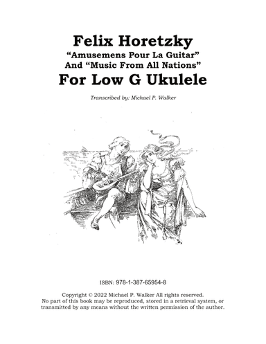 Ukulele - Level 2 - Digital Download SKU: A0.1098334 Composed by Felix Horetzky. Arranged by Michael P Walker. Classical,Romantic Period. Score. 96 pages. Michael P Walker #702203. Published by Michael P Walker (A0.1098334). Who would have thought you could play classical music on a ukulele? But you can! Here are delightful pieces by Felix Horetzky from the 19th Century – the Romantic Era – arranged for the Low G ukulele. These 12 compositions from Horetzky’s Opus 18 – Amusements Pour La Guitar and 60 short compositions of “Music From All Nations” are approachable to well-practiced beginners while still posing a challenge to intermediate performers. Have fun! This product was created by a member of ArrangeMe, Hal Leonard’s global self-publishing community of independent composers, arrangers, and songwriters. ArrangeMe allows for the publication of unique arrangements of both popular titles and original compositions from a wide variety of voices and backgrounds. About Digital Downloads Digital Downloads are downloadable sheet music files that can be viewed directly on your computer, tablet or mobile device. Once you download your digital sheet music, you can view and print it at home, school, or anywhere you want to make music, and you don’t have to be connected to the internet. Just purchase, download and play! PLEASE NOTE: Your Digital Download will have a watermark at the bottom of each page that will include your name, purchase date and number of copies purchased. You are only authorized to print the number of copies that you have purchased. You may not digitally distribute or print more copies than purchased for use (i.e., you may not print or digitally distribute individual copies to friends or students).
