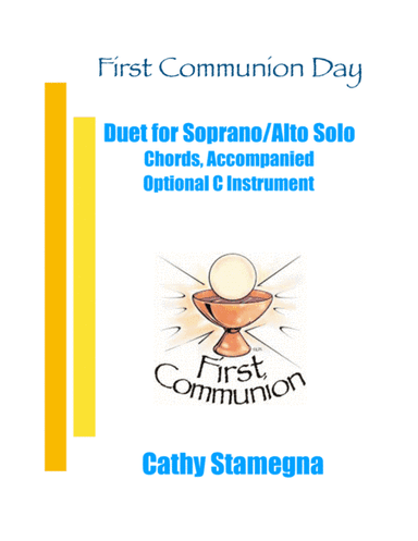 Piano,Voice Duet Piano,Voice - Level 3 - Digital Download SKU: A0.780434 Composed by Cathy Stamegna. Arranged by Cathy Stamegna. Children,Contemporary,Pop,Praise & Worship,Sacred. 7 pages. Cathy Stamegna #4887137. Published by Cathy Stamegna (A0.780434). This lovely First Communion Day hymn may be sung as a duet (children through adults) by the First Communicants, or combined group duet with adults and children. (Alternate lyrics for First Communicants). Score & C Instrument Part. This product was created by a member of ArrangeMe, Hal Leonard’s global self-publishing community of independent composers, arrangers, and songwriters. ArrangeMe allows for the publication of unique arrangements of both popular titles and original compositions from a wide variety of voices and backgrounds. About Digital Downloads Digital Downloads are downloadable sheet music files that can be viewed directly on your computer, tablet or mobile device. Once you download your digital sheet music, you can view and print it at home, school, or anywhere you want to make music, and you don’t have to be connected to the internet. Just purchase, download and play! PLEASE NOTE: Your Digital Download will have a watermark at the bottom of each page that will include your name, purchase date and number of copies purchased. You are only authorized to print the number of copies that you have purchased. You may not digitally distribute or print more copies than purchased for use (i.e., you may not print or digitally distribute individual copies to friends or students).