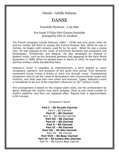 Woodwind Ensemble Clarinet - Level 5 - Digital Download SKU: A0.840346 Composed by Claude Debussy. Arranged by Glen D. Lienhart. 20th Century. 85 pages. Glen D. Lienhart #5010461. Published by Glen D. Lienhart (A0.840346). Grade V clarinet octet or choir, with several alternate parts. This product was created by a member of ArrangeMe, Hal Leonard’s global self-publishing community of independent composers, arrangers, and songwriters. ArrangeMe allows for the publication of unique arrangements of both popular titles and original compositions from a wide variety of voices and backgrounds. About Digital Downloads Digital Downloads are downloadable sheet music files that can be viewed directly on your computer, tablet or mobile device. Once you download your digital sheet music, you can view and print it at home, school, or anywhere you want to make music, and you don’t have to be connected to the internet. Just purchase, download and play! PLEASE NOTE: Your Digital Download will have a watermark at the bottom of each page that will include your name, purchase date and number of copies purchased. You are only authorized to print the number of copies that you have purchased. You may not digitally distribute or print more copies than purchased for use (i.e., you may not print or digitally distribute individual copies to friends or students).