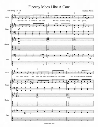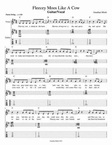 Guitar - Level 4 - Digital Download SKU: A0.1020608 Composed by Jonathan Monk. Children,Contemporary,Jazz,Pop. Guitar Tab. 6 pages. Jonathan Monk #4894973. Published by Jonathan Monk (A0.1020608). A shy sheep on the farm learns to moo and makes new friends! This product was created by a member of ArrangeMe, Hal Leonard’s global self-publishing community of independent composers, arrangers, and songwriters. ArrangeMe allows for the publication of unique arrangements of both popular titles and original compositions from a wide variety of voices and backgrounds. About Digital Downloads Digital Downloads are downloadable sheet music files that can be viewed directly on your computer, tablet or mobile device. Once you download your digital sheet music, you can view and print it at home, school, or anywhere you want to make music, and you don’t have to be connected to the internet. Just purchase, download and play! PLEASE NOTE: Your Digital Download will have a watermark at the bottom of each page that will include your name, purchase date and number of copies purchased. You are only authorized to print the number of copies that you have purchased. You may not digitally distribute or print more copies than purchased for use (i.e., you may not print or digitally distribute individual copies to friends or students).