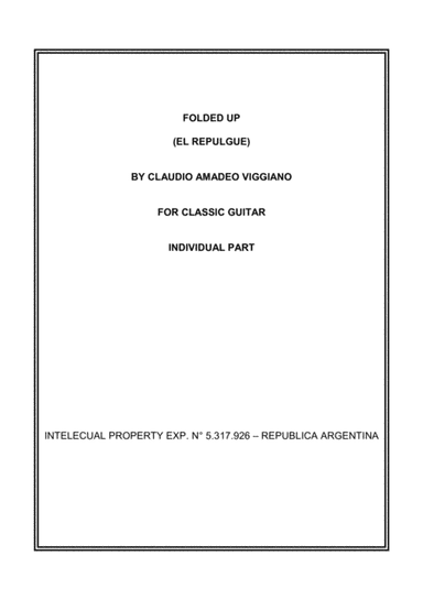 Solo Guitar - Level 2 - Digital Download SKU: A0.807841 Composed by Claudio Amadeo Viggiano. Contemporary,Folk,Latin,World. Individual part. 5 pages. Claudio viggiano #3686825. Published by claudio viggiano (A0.807841). An original composition for classic guitar. Rhythmic pattern is from Argentine "milonga". My email contact: [email protected]. This product was created by a member of ArrangeMe, Hal Leonard's global self-publishing community of independent composers, arrangers, and songwriters. ArrangeMe allows for the publication of unique arrangements of popular titles and original compositions from a variety of voices and backgrounds. The length, difficulty, and retail pricing are determined solely by the discretion of the person who arranged or composed it. About Digital Downloads Digital Downloads are downloadable sheet music files that can be viewed directly on your computer, tablet or mobile device. Once you download your digital sheet music, you can view and print it at home, school, or anywhere you want to make music, and you don’t have to be connected to the internet. Just purchase, download and play! PLEASE NOTE: Your Digital Download will have a watermark at the bottom of each page that will include your name, purchase date and number of copies purchased. You are only authorized to print the number of copies that you have purchased. You may not digitally distribute or print more copies than purchased for use (i.e., you may not print or digitally distribute individual copies to friends or students).