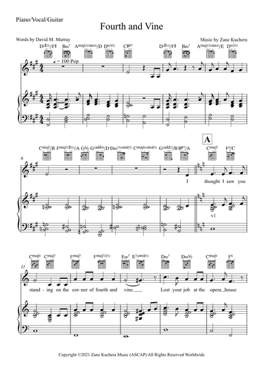 Guitar,Piano,Vocal,Voice - Level 3 - Digital Download SKU: A0.1111861 By Zane Kuchera. By Music by Zane Kuchera and words by David M. Murray. Arranged by Zane Kuchera. Broadway,Film/TV,Folk,Musical/Show,Pop,Singer/Songwriter. Score. 8 pages. Zane Kuchera Music #714072. Published by Zane Kuchera Music (A0.1111861). “Fourth and Vine” - “A tear ran down my face, I was frozen in my tracks, seeing you on the corner like that, without the guts to act.” Words: David M. Murray, music and performance: Zane Kuchera ©2021 Zane Kuchera Music (ASCAP) All Rights Reserved Worldwide https://album.link/9n0tf8kptgpsm zanekuchera.com. This product was created by a member of ArrangeMe, Hal Leonard's global self-publishing community of independent composers, arrangers, and songwriters. ArrangeMe allows for the publication of unique arrangements of popular titles and original compositions from a variety of voices and backgrounds. The length, difficulty, and retail pricing are determined solely by the discretion of the person who arranged or composed it. About Digital Downloads Digital Downloads are downloadable sheet music files that can be viewed directly on your computer, tablet or mobile device. Once you download your digital sheet music, you can view and print it at home, school, or anywhere you want to make music, and you don’t have to be connected to the internet. Just purchase, download and play! PLEASE NOTE: Your Digital Download will have a watermark at the bottom of each page that will include your name, purchase date and number of copies purchased. You are only authorized to print the number of copies that you have purchased. You may not digitally distribute or print more copies than purchased for use (i.e., you may not print or digitally distribute individual copies to friends or students).