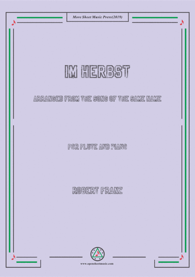 Flute,Piano - Level 3 - Digital Download SKU: A0.671205 Composed by Franz. Arranged by MSM. Classical,Romantic Period. Score and part. 11 pages. Open Cloud #4796415. Published by Open Cloud (A0.671205). This product(include full and parts score) is a digital sheet music in PDF format. The music was composed by Franz (Robert Franz), 1815-1892, arrange by MSM Press, for Flute and Piano. This product was created by a member of ArrangeMe, Hal Leonard’s global self-publishing community of independent composers, arrangers, and songwriters. ArrangeMe allows for the publication of unique arrangements of both popular titles and original compositions from a wide variety of voices and backgrounds. About Digital Downloads Digital Downloads are downloadable sheet music files that can be viewed directly on your computer, tablet or mobile device. Once you download your digital sheet music, you can view and print it at home, school, or anywhere you want to make music, and you don’t have to be connected to the internet. Just purchase, download and play! PLEASE NOTE: Your Digital Download will have a watermark at the bottom of each page that will include your name, purchase date and number of copies purchased. You are only authorized to print the number of copies that you have purchased. You may not digitally distribute or print more copies than purchased for use (i.e., you may not print or digitally distribute individual copies to friends or students).