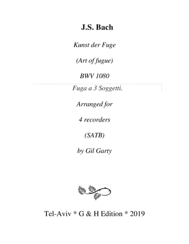 Recorder - Digital Download SKU: A0.756610 Composed by Johann Sebastian Bach. Arranged by Gil Garty. Baroque. Recorder Ensemble. 20 pages. Gil Garty #4727475. Published by Gil Garty (A0.756610). Unfinished work. Originally for 4 unspecified instruments. Arranged for 4 recorders (SATB or SATgB). This product was created by a member of ArrangeMe, Hal Leonard's global self-publishing community of independent composers, arrangers, and songwriters. ArrangeMe allows for the publication of unique arrangements of popular titles and original compositions from a variety of voices and backgrounds. The length, difficulty, and retail pricing are determined solely by the discretion of the person who arranged or composed it. About Digital Downloads Digital Downloads are downloadable sheet music files that can be viewed directly on your computer, tablet or mobile device. Once you download your digital sheet music, you can view and print it at home, school, or anywhere you want to make music, and you don’t have to be connected to the internet. Just purchase, download and play! PLEASE NOTE: Your Digital Download will have a watermark at the bottom of each page that will include your name, purchase date and number of copies purchased. You are only authorized to print the number of copies that you have purchased. You may not digitally distribute or print more copies than purchased for use (i.e., you may not print or digitally distribute individual copies to friends or students).