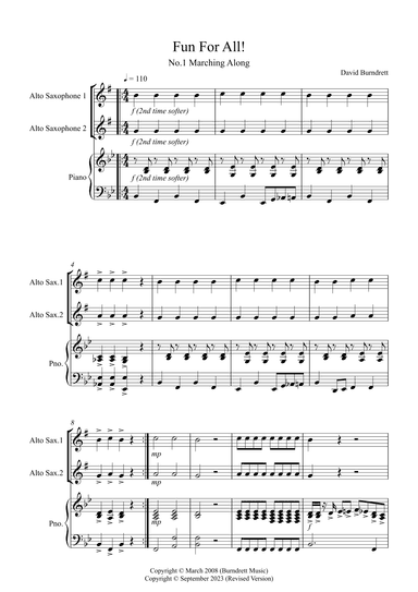 Alto Saxophone Duet Alto Saxophone - Level 1 - Digital Download SKU: A0.1287777 Composed by David Burndrett. Rock. 2 scores. 9 pages. David Burndrett #878862. Published by David Burndrett (A0.1287777). I have written this for beginner alto saxophones using quite easy notes. I composed these pieces of different moods to aim to help with beginner technique and musicality.It includes an optional easy piano part for added support.No.1 Marching alongNo.2 Sad SongNo.3 Twelve Bar Blues Boogie!Download includes the score and all of the parts. This product was created by a member of ArrangeMe, Hal Leonard's global self-publishing community of independent composers, arrangers, and songwriters. ArrangeMe allows for the publication of unique arrangements of popular titles and original compositions from a variety of voices and backgrounds. The length, difficulty, and retail pricing are determined solely by the discretion of the person who arranged or composed it. About Digital Downloads Digital Downloads are downloadable sheet music files that can be viewed directly on your computer, tablet or mobile device. Once you download your digital sheet music, you can view and print it at home, school, or anywhere you want to make music, and you don’t have to be connected to the internet. Just purchase, download and play! PLEASE NOTE: Your Digital Download will have a watermark at the bottom of each page that will include your name, purchase date and number of copies purchased. You are only authorized to print the number of copies that you have purchased. You may not digitally distribute or print more copies than purchased for use (i.e., you may not print or digitally distribute individual copies to friends or students).