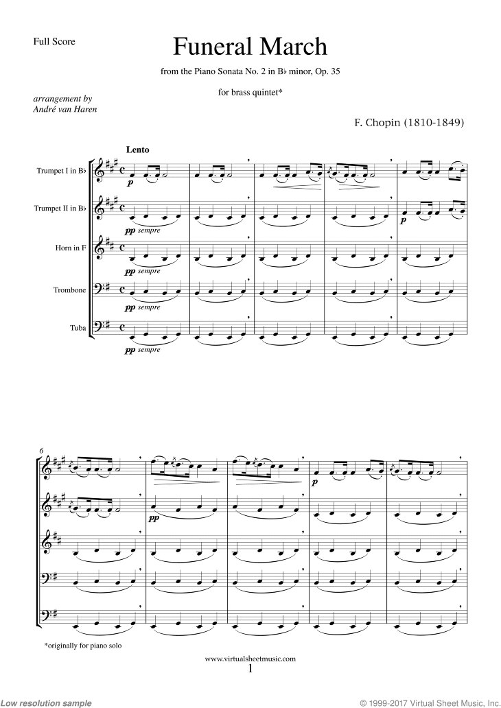 High-quality Digital sheet music for brass quintet, Full Score & Single Parts, from Sonata Op.35, for piano solo (optional parts for horn in Eb, trombone II, trombone I in Bb, trombone II in Bb and tuba in Eb included).Publisher: Virtual Sheet MusicThis item includes: PDF (digital sheet music to download and print), Interactive Sheet Music (for online playing, transposition and printing), Videos, MIDI and Mp3 audio files (including Mp3 music accompaniment tracks to play along)*Once you buy or access this item as a Member, you'll be able to download everything included as a single .zip file.Instrumentation:brass quintetSkill Level:intermediateGenre:classicalKey Signature:E minorTime Signature:4/4Tempo:♩=62 BPM (real metronome 63 BPM)Duration:14' 2"Total Pages:28