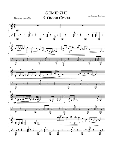 Piano Solo - Level 3 - Digital Download SKU: A0.1277621 By Aleksandar Kačurov. By Aleksandar Kačurov. Arranged by Aleksandar Kačurov. 21st Century,Contemporary,Folk,Jazz,Patriotic. Score. 8 pages. Aleksandar Kacurov #869299. Published by Aleksandar Kacurov (A0.1277621). Gemidžije ( The Boatmen ) is original composition in 5 individual parts for piano solo by Aleksandar Kačurov inspired by historic events from Macedonian history. This product was created by a member of ArrangeMe, Hal Leonard’s global self-publishing community of independent composers, arrangers, and songwriters. ArrangeMe allows for the publication of unique arrangements of both popular titles and original compositions from a wide variety of voices and backgrounds. About Digital Downloads Digital Downloads are downloadable sheet music files that can be viewed directly on your computer, tablet or mobile device. Once you download your digital sheet music, you can view and print it at home, school, or anywhere you want to make music, and you don’t have to be connected to the internet. Just purchase, download and play! PLEASE NOTE: Your Digital Download will have a watermark at the bottom of each page that will include your name, purchase date and number of copies purchased. You are only authorized to print the number of copies that you have purchased. You may not digitally distribute or print more copies than purchased for use (i.e., you may not print or digitally distribute individual copies to friends or students).