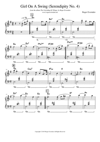 Easy Piano - Level 3 - Digital Download SKU: A0.910385 Composed by Roger Evernden. 20th Century,Contemporary,New Age. Score. 3 pages. Roger Brian Evernden #5001767. Published by Roger Brian Evernden (A0.910385). GIrl On A Swing is the 4th Serendipity by Roger Evernden, released as a single in 2019.It features on the 2020 album The Unfolding Of Wings by Roger Evernden.In a style reminiscent of Erik Satie - Gymnopedie and Gnossienne. This product was created by a member of ArrangeMe, Hal Leonard’s global self-publishing community of independent composers, arrangers, and songwriters. ArrangeMe allows for the publication of unique arrangements of both popular titles and original compositions from a wide variety of voices and backgrounds. About Digital Downloads Digital Downloads are downloadable sheet music files that can be viewed directly on your computer, tablet or mobile device. Once you download your digital sheet music, you can view and print it at home, school, or anywhere you want to make music, and you don’t have to be connected to the internet. Just purchase, download and play! PLEASE NOTE: Your Digital Download will have a watermark at the bottom of each page that will include your name, purchase date and number of copies purchased. You are only authorized to print the number of copies that you have purchased. You may not digitally distribute or print more copies than purchased for use (i.e., you may not print or digitally distribute individual copies to friends or students).