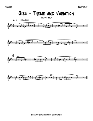 Trumpet Solo - Level 3 - Digital Download SKU: A0.800681 Composed by Court Mast. Contemporary,Folk,Instructional,Sacred. Individual part. 2 pages. Court Mast #2020641. Published by Court Mast (A0.800681). Giza is a slow, haunting Middle Eastern melody in B-flat concert featuring melodic minor (C melodic minor for trumpet). The Variation is a little slower than the Theme and presents a number of tricky embellishments, such as grace notes that occur before the beat and short trills that occur on the beat. Exotic to Western ears, Giza’s melody is distilled to only a few notes, each one weighted with deep meaning. This product was created by a member of ArrangeMe, Hal Leonard's global self-publishing community of independent composers, arrangers, and songwriters. ArrangeMe allows for the publication of unique arrangements of popular titles and original compositions from a variety of voices and backgrounds. The length, difficulty, and retail pricing are determined solely by the discretion of the person who arranged or composed it. About Digital Downloads Digital Downloads are downloadable sheet music files that can be viewed directly on your computer, tablet or mobile device. Once you download your digital sheet music, you can view and print it at home, school, or anywhere you want to make music, and you don’t have to be connected to the internet. Just purchase, download and play! PLEASE NOTE: Your Digital Download will have a watermark at the bottom of each page that will include your name, purchase date and number of copies purchased. You are only authorized to print the number of copies that you have purchased. You may not digitally distribute or print more copies than purchased for use (i.e., you may not print or digitally distribute individual copies to friends or students).