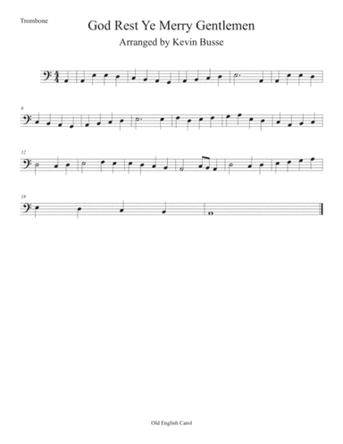 Trombone Solo - Level 1 - Digital Download SKU: A0.604550 Arranged by Kevin Busse. Christmas. Individual part. 1 pages. Kevin Busse #3907903. Published by Kevin Busse (A0.604550). This is a simple transcription of God Rest Ye Merry Gentlemen which is an Old English Carol modified in the easy key of C for  Trombone This product was created by a member of ArrangeMe, Hal Leonard’s global self-publishing community of independent composers, arrangers, and songwriters. ArrangeMe allows for the publication of unique arrangements of both popular titles and original compositions from a wide variety of voices and backgrounds. About Digital Downloads Digital Downloads are downloadable sheet music files that can be viewed directly on your computer, tablet or mobile device. Once you download your digital sheet music, you can view and print it at home, school, or anywhere you want to make music, and you don’t have to be connected to the internet. Just purchase, download and play! PLEASE NOTE: Your Digital Download will have a watermark at the bottom of each page that will include your name, purchase date and number of copies purchased. You are only authorized to print the number of copies that you have purchased. You may not digitally distribute or print more copies than purchased for use (i.e., you may not print or digitally distribute individual copies to friends or students).