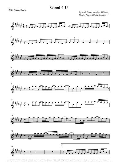 Easy Piano - Level 2 - Digital Download SKU: A0.1170436 By Olivia Rodrigo. By Daniel Nigro, Hayley Williams, Josh Farro, and Olivia Rodrigo. Arranged by Dennis Cheng. Grunge,Instructional,Pop,Rock,Singer/Songwriter. Score. 3 pages. Dennis Cheng #770806. Published by Dennis Cheng (A0.1170436). Easy beginner version of "Good 4 U" by Olivia Rodrigo for the beginner to early intermediate level piano player. Great for teaching beginner students. Instead of a 7-10 page arrangement, this is a 3 page arrangement with repeats.Knowledge of ties, syncopation, intervals (5ths, 6ths, 7ths) helpful. Learn piano online from the arranger: https://www.thekeyspacenj.com/Arranger's channel: https://www.youtube.com/user/dc24fly. This product was created by a member of ArrangeMe, Hal Leonard's global self-publishing community of independent composers, arrangers, and songwriters. ArrangeMe allows for the publication of unique arrangements of popular titles and original compositions from a variety of voices and backgrounds. The length, difficulty, and retail pricing are determined solely by the discretion of the person who arranged or composed it. About Digital Downloads Digital Downloads are downloadable sheet music files that can be viewed directly on your computer, tablet or mobile device. Once you download your digital sheet music, you can view and print it at home, school, or anywhere you want to make music, and you don’t have to be connected to the internet. Just purchase, download and play! PLEASE NOTE: Your Digital Download will have a watermark at the bottom of each page that will include your name, purchase date and number of copies purchased. You are only authorized to print the number of copies that you have purchased. You may not digitally distribute or print more copies than purchased for use (i.e., you may not print or digitally distribute individual copies to friends or students).