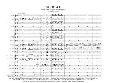 Concert Band - Digital Download SKU: A0.1008283 By Olivia Rodrigo. By Daniel Nigro, Hayley Williams, Josh Farro, and Olivia Rodrigo. Arranged by William Brenner. Pop. Score and parts. 69 pages. William Brenner #6499531. Published by William Brenner (A0.1008283). Here is an arrangement of "Good 4 U" by Olivia Rodrigo. It is great for intermediate concert bands, as it includes a lot of rhythmic and the song is accessible to a large public awn well as fun to play by the students.For any questions, write to: [email protected] This product was created by a member of ArrangeMe, Hal Leonard’s global self-publishing community of independent composers, arrangers, and songwriters. ArrangeMe allows for the publication of unique arrangements of both popular titles and original compositions from a wide variety of voices and backgrounds. About Digital Downloads Digital Downloads are downloadable sheet music files that can be viewed directly on your computer, tablet or mobile device. Once you download your digital sheet music, you can view and print it at home, school, or anywhere you want to make music, and you don’t have to be connected to the internet. Just purchase, download and play! PLEASE NOTE: Your Digital Download will have a watermark at the bottom of each page that will include your name, purchase date and number of copies purchased. You are only authorized to print the number of copies that you have purchased. You may not digitally distribute or print more copies than purchased for use (i.e., you may not print or digitally distribute individual copies to friends or students).