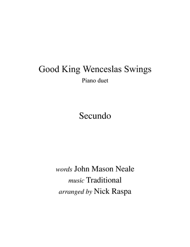 1 Piano,4 Hands,Piano Duet - Level 2 - Digital Download SKU: A0.754633 Composed by Traditional. Arranged by Nick Raspa. Christmas,Holiday,Jazz. Score. 4 pages. NJR Music #6715025. Published by NJR Music (A0.754633). This is the Secundo part to a lively swing version of "Good King Wenceslas". Listen to the entire arrangement on YouTube. ASCAPThe Primo part is sold separately at: Sheet Music Direct Sheet Music Plus This product was created by a member of ArrangeMe, Hal Leonard’s global self-publishing community of independent composers, arrangers, and songwriters. ArrangeMe allows for the publication of unique arrangements of both popular titles and original compositions from a wide variety of voices and backgrounds. About Digital Downloads Digital Downloads are downloadable sheet music files that can be viewed directly on your computer, tablet or mobile device. Once you download your digital sheet music, you can view and print it at home, school, or anywhere you want to make music, and you don’t have to be connected to the internet. Just purchase, download and play! PLEASE NOTE: Your Digital Download will have a watermark at the bottom of each page that will include your name, purchase date and number of copies purchased. You are only authorized to print the number of copies that you have purchased. You may not digitally distribute or print more copies than purchased for use (i.e., you may not print or digitally distribute individual copies to friends or students).