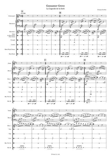Percussion Quintet Cymbals,Glockenspiel,Marimba,Taiko Drum,Triangle,Wind Chimes,Woodblock - Level 3 - Digital Download SKU: A0.1299937 By Francois Du Bois. By Francois Du Bois. 21st Century,Multicultural,Spiritual,World. 13 pages. D-Project Co., Ltd. #889695. Published by D-Project Co., Ltd. (A0.1299937). Discover "Gossamer grove" from the album "La Légende De La Forêt" Marimba Ensemble ScoresStep into the mesmerizing world of "Gossamer grove" from the album "La Légende De La Forêt," composed by a French artist residing in Japan. Inspired by the mystical "tengu" spirit of the Japanese forest, this digital score collection offers 35,000 album-selling music that's both melodious and mysterious.Nature's Musical JourneyImmerse yourself in the enchanting melodies that have graced concert halls across Japan. As you explore these scores, you'll uncover subtle nuances that demand your musicality and take your audience on an imaginative trip through the forest's depths.Versatile SoundtracksBeyond the stage, this music has found its way into TV documentaries, films, and healing retreats, setting the perfect mood for various multimedia projects.Elevate Your RepertoireWhether you're an experienced marimba player or just starting, "Gossamer grove" adds depth and beauty to your repertoire. Elevate your performances with this captivating music.Don't miss out on owning this exceptional marimba ensemble score collection. Experience the legend of the forest and captivate your audience with "Gossamer grove" today! Recording played by Francois Du Bois: https://music.youtube.com/watch?v=VQFzOMas4b8&feature=sharedInstrumentation: Marimba 1, Marimba 2, Taiko (or Bass drum / Floor drum), Triangle, Cymbal, Metal Wind Chimes, Wood Block, GlockenspielDuration: 4'32"Level: IntermediateSize: All parts B3 / Parts A4This can be played either as a trio or a quintet, as per your preference. This product was created by a member of ArrangeMe, Hal Leonard’s global self-publishing community of independent composers, arrangers, and songwriters. ArrangeMe allows for the publication of unique arrangements of both popular titles and original compositions from a wide variety of voices and backgrounds. About Digital Downloads Digital Downloads are downloadable sheet music files that can be viewed directly on your computer, tablet or mobile device. Once you download your digital sheet music, you can view and print it at home, school, or anywhere you want to make music, and you don’t have to be connected to the internet. Just purchase, download and play! PLEASE NOTE: Your Digital Download will have a watermark at the bottom of each page that will include your name, purchase date and number of copies purchased. You are only authorized to print the number of copies that you have purchased. You may not digitally distribute or print more copies than purchased for use (i.e., you may not print or digitally distribute individual copies to friends or students).