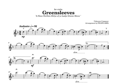Violin Solo - Level 5 - Digital Download SKU: A0.922821 Composed by Henry VIII. Arranged by Dr. Chia-Chien Goh. Christmas,Concert,Contemporary,Traditional,Wedding. 2 pages. Dr. Chia-Chien Goh #6274429. Published by Dr. Chia-Chien Goh (A0.922821). This Greensleeves for Solo Violin arrangement of this hauntingly beautiful tune is for the advanced player.  It is great for small events, recitals, and encores.  I hope you enjoy performing this piece as much as I do! This product was created by a member of ArrangeMe, Hal Leonard's global self-publishing community of independent composers, arrangers, and songwriters. ArrangeMe allows for the publication of unique arrangements of popular titles and original compositions from a variety of voices and backgrounds. The length, difficulty, and retail pricing are determined solely by the discretion of the person who arranged or composed it. About Digital Downloads Digital Downloads are downloadable sheet music files that can be viewed directly on your computer, tablet or mobile device. Once you download your digital sheet music, you can view and print it at home, school, or anywhere you want to make music, and you don’t have to be connected to the internet. Just purchase, download and play! PLEASE NOTE: Your Digital Download will have a watermark at the bottom of each page that will include your name, purchase date and number of copies purchased. You are only authorized to print the number of copies that you have purchased. You may not digitally distribute or print more copies than purchased for use (i.e., you may not print or digitally distribute individual copies to friends or students).