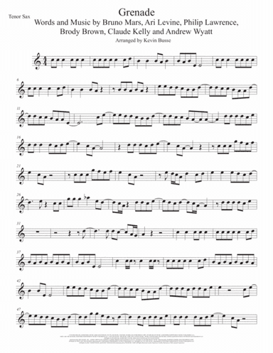 Trombone Solo - Level 2 - Digital Download SKU: A0.605866 By Bruno Mars. By Andrew Wyatt, Ari Levine, Brody Brown, Bruno Mars, Claude Kelly, and Philip Lawrence. Arranged by Kevin Busse. Pop,R & B. Individual part. 2 pages. Kevin Busse #4303607. Published by Kevin Busse (A0.605866). This is an exact transcription of Grenade by Bruno Mars in a good range for Trombone. This product was created by a member of ArrangeMe, Hal Leonard's global self-publishing community of independent composers, arrangers, and songwriters. ArrangeMe allows for the publication of unique arrangements of popular titles and original compositions from a variety of voices and backgrounds. The length, difficulty, and retail pricing are determined solely by the discretion of the person who arranged or composed it. About Digital Downloads Digital Downloads are downloadable sheet music files that can be viewed directly on your computer, tablet or mobile device. Once you download your digital sheet music, you can view and print it at home, school, or anywhere you want to make music, and you don’t have to be connected to the internet. Just purchase, download and play! PLEASE NOTE: Your Digital Download will have a watermark at the bottom of each page that will include your name, purchase date and number of copies purchased. You are only authorized to print the number of copies that you have purchased. You may not digitally distribute or print more copies than purchased for use (i.e., you may not print or digitally distribute individual copies to friends or students).