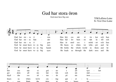 C Instrument - Level 1 - Digital Download SKU: A0.1184181 Composed by LaDena Laine. Arranged by LaDena Laine. Children,Christian,Praise & Worship,Religious. Lead Sheet / Fake Book. 1 pages. LaDena Laine #783892. Published by LaDena Laine (A0.1184181). This is a fun song about God having Large ears, hands and eyes. He hears us, protects us, and watches us. This songs is fun for childrens' groups and can be sung in around. It has both lyrics in Swedish and English. This product was created by a member of ArrangeMe, Hal Leonard's global self-publishing community of independent composers, arrangers, and songwriters. ArrangeMe allows for the publication of unique arrangements of popular titles and original compositions from a variety of voices and backgrounds. The length, difficulty, and retail pricing are determined solely by the discretion of the person who arranged or composed it. About Digital Downloads Digital Downloads are downloadable sheet music files that can be viewed directly on your computer, tablet or mobile device. Once you download your digital sheet music, you can view and print it at home, school, or anywhere you want to make music, and you don’t have to be connected to the internet. Just purchase, download and play! PLEASE NOTE: Your Digital Download will have a watermark at the bottom of each page that will include your name, purchase date and number of copies purchased. You are only authorized to print the number of copies that you have purchased. You may not digitally distribute or print more copies than purchased for use (i.e., you may not print or digitally distribute individual copies to friends or students).