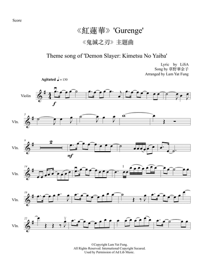 Piano Solo - Level 3 - Digital Download SKU: A0.1503494 Composed by Kayoko Kusano and Lisa Oribe. Arranged by Tomoko Mikami. Children,Film/TV,Pop,Rock. Score. 5 pages. Tomoko Mikami #1078955. Published by Tomoko Mikami (A0.1503494). Piano solo arrangement for intermediate level. This is the popular Japanese anime song from Deamon Slayers. This product was created by a member of ArrangeMe, Hal Leonard’s global self-publishing community of independent composers, arrangers, and songwriters. ArrangeMe allows for the publication of unique arrangements of both popular titles and original compositions from a wide variety of voices and backgrounds. About Digital Downloads Digital Downloads are downloadable sheet music files that can be viewed directly on your computer, tablet or mobile device. Once you download your digital sheet music, you can view and print it at home, school, or anywhere you want to make music, and you don’t have to be connected to the internet. Just purchase, download and play! PLEASE NOTE: Your Digital Download will have a watermark at the bottom of each page that will include your name, purchase date and number of copies purchased. You are only authorized to print the number of copies that you have purchased. You may not digitally distribute or print more copies than purchased for use (i.e., you may not print or digitally distribute individual copies to friends or students).