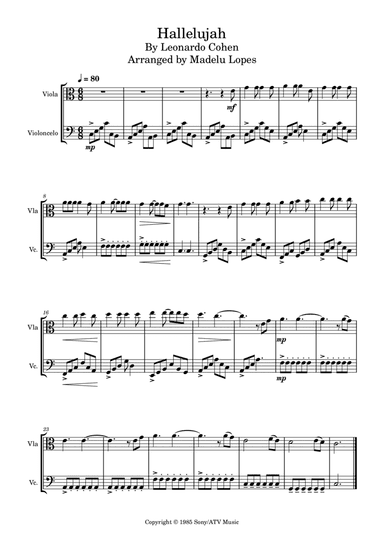 Violin Duet Violin - Level 1 - Digital Download SKU: A0.1319065 By Andrea Bocelli. By Leonard Cohen. Arranged by Iury Cardoso. Folk,Pop,Religious,Sacred,Wedding. 7 pages. Iury Cardoso #907665. Published by Iury Cardoso (A0.1319065). EASY VIOLIN DUET arrangement of the song: "Hallelujah" (Leonard Cohen) (Score and parts: 7 pages) This is a version of the classic song "Hallelujah". In this easy arrangement, the simplified melodies make learning easier and allows violin students to have a fun chamber music experience. Call a friend or your teacher to play with you!The CHORDS are not included on this arrangement (there is also a version with the chords on this website). On this site, there is also several other versions of "hallelujah" arrangement for other instruments (like violin/piano, violin/guitar, easy string quartet or quintet-with or without piano). See more arrangements by Iury Cardoso, thank you so much! Copyright © 1985 Sony/ATV Music Publishing LLC This arrangement Copyright © 2016 Sony/ATV Music Publishing LLC All Rights Administered by Sony/ATV Music Publishing LLC, 424 Church Street, Suite 1200, Nashville, TN 37219 International Copyright Secured All Rights Reserved hallelujah sheet musiceasy violin duetviolin duet sheet musicviolin duet for beginnerseasy arrangementviolin duet hallelujahhallelujah duet sheet musichallelujah easy dueteasy violineasy beginner Easy beginner violin dueteasy duet pop musicbeginning duetduet for beginnersViolin for beginnerssheet musiceasy scoremusic score. This product was created by a member of ArrangeMe, Hal Leonard’s global self-publishing community of independent composers, arrangers, and songwriters. ArrangeMe allows for the publication of unique arrangements of both popular titles and original compositions from a wide variety of voices and backgrounds. About Digital Downloads Digital Downloads are downloadable sheet music files that can be viewed directly on your computer, tablet or mobile device. Once you download your digital sheet music, you can view and print it at home, school, or anywhere you want to make music, and you don’t have to be connected to the internet. Just purchase, download and play! PLEASE NOTE: Your Digital Download will have a watermark at the bottom of each page that will include your name, purchase date and number of copies purchased. You are only authorized to print the number of copies that you have purchased. You may not digitally distribute or print more copies than purchased for use (i.e., you may not print or digitally distribute individual copies to friends or students).
