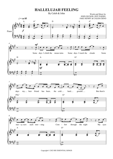 Easy Piano - Level 1 - Digital Download SKU: A0.1294638 Composed by Caleb Crino, Jake Henry, Jeff Pardo, and John Secker. Arranged by SCMusic. Christian,Contemporary,Pop,Praise & Worship,Rock. Score. 3 pages. SCMusic #884990. Published by SCMusic (A0.1294638). An easy piano arrangment of 'Hallelujah Feeling' by Caleb & John, in a slightly lower key for simplification. This product was created by a member of ArrangeMe, Hal Leonard’s global self-publishing community of independent composers, arrangers, and songwriters. ArrangeMe allows for the publication of unique arrangements of both popular titles and original compositions from a wide variety of voices and backgrounds. About Digital Downloads Digital Downloads are downloadable sheet music files that can be viewed directly on your computer, tablet or mobile device. Once you download your digital sheet music, you can view and print it at home, school, or anywhere you want to make music, and you don’t have to be connected to the internet. Just purchase, download and play! PLEASE NOTE: Your Digital Download will have a watermark at the bottom of each page that will include your name, purchase date and number of copies purchased. You are only authorized to print the number of copies that you have purchased. You may not digitally distribute or print more copies than purchased for use (i.e., you may not print or digitally distribute individual copies to friends or students).