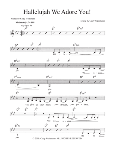 Piano,Vocal,Voice - Level 1 - Digital Download SKU: A0.835121 Composed by Cody Weinmann. Christian,Sacred. Score. 4 pages. Cody Weinmann #4737799. Published by Cody Weinmann (A0.835121). This is the original A-flat version of my contemporary worship song, a song of praise, entitled "Hallelujah, We Adore You." This is a great opener or closer for worship services as well as special events. The run time on this piece runs three minutes and 40 seconds. This product was created by a member of ArrangeMe, Hal Leonard's global self-publishing community of independent composers, arrangers, and songwriters. ArrangeMe allows for the publication of unique arrangements of popular titles and original compositions from a variety of voices and backgrounds. The length, difficulty, and retail pricing are determined solely by the discretion of the person who arranged or composed it. About Digital Downloads Digital Downloads are downloadable sheet music files that can be viewed directly on your computer, tablet or mobile device. Once you download your digital sheet music, you can view and print it at home, school, or anywhere you want to make music, and you don’t have to be connected to the internet. Just purchase, download and play! PLEASE NOTE: Your Digital Download will have a watermark at the bottom of each page that will include your name, purchase date and number of copies purchased. You are only authorized to print the number of copies that you have purchased. You may not digitally distribute or print more copies than purchased for use (i.e., you may not print or digitally distribute individual copies to friends or students).