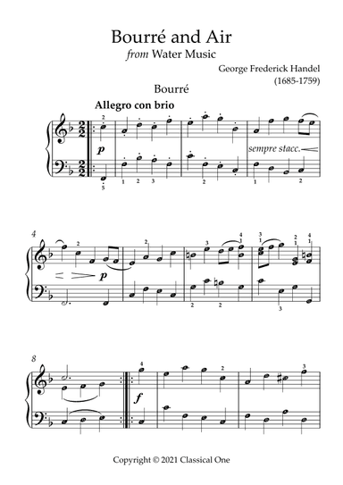 Easy Piano - Level 2 - Digital Download SKU: A0.1040589 Composed by George Frideric Handel. Arranged by MPS. Classical. Score. 4 pages. Classic Piano sheetz #645383. Published by Classic Piano sheetz (A0.1040589). Handel - Bourree and Air (from Water Music)(With Note name). This product was created by a member of ArrangeMe, Hal Leonard’s global self-publishing community of independent composers, arrangers, and songwriters. ArrangeMe allows for the publication of unique arrangements of both popular titles and original compositions from a wide variety of voices and backgrounds. About Digital Downloads Digital Downloads are downloadable sheet music files that can be viewed directly on your computer, tablet or mobile device. Once you download your digital sheet music, you can view and print it at home, school, or anywhere you want to make music, and you don’t have to be connected to the internet. Just purchase, download and play! PLEASE NOTE: Your Digital Download will have a watermark at the bottom of each page that will include your name, purchase date and number of copies purchased. You are only authorized to print the number of copies that you have purchased. You may not digitally distribute or print more copies than purchased for use (i.e., you may not print or digitally distribute individual copies to friends or students).