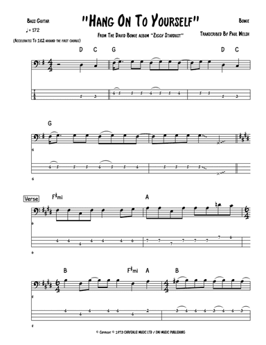 Bass Guitar - Level 3 - Digital Download SKU: A0.838694 By David Bowie. By David Bowie. Arranged by Accubass. Pop,Rock. Score. 14 pages. Accubass #6502327. Published by Accubass (A0.838694). Complete bassline with TAB. This product was created by a member of ArrangeMe, Hal Leonard's global self-publishing community of independent composers, arrangers, and songwriters. ArrangeMe allows for the publication of unique arrangements of popular titles and original compositions from a variety of voices and backgrounds. The length, difficulty, and retail pricing are determined solely by the discretion of the person who arranged or composed it. About Digital Downloads Digital Downloads are downloadable sheet music files that can be viewed directly on your computer, tablet or mobile device. Once you download your digital sheet music, you can view and print it at home, school, or anywhere you want to make music, and you don’t have to be connected to the internet. Just purchase, download and play! PLEASE NOTE: Your Digital Download will have a watermark at the bottom of each page that will include your name, purchase date and number of copies purchased. You are only authorized to print the number of copies that you have purchased. You may not digitally distribute or print more copies than purchased for use (i.e., you may not print or digitally distribute individual copies to friends or students).