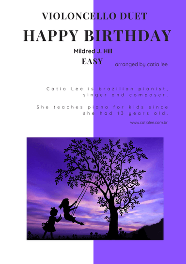 Cello Duet Cello - Level 1 - Digital Download SKU: A0.529567 Composed by Mildred J. Hill. Arranged by Catia Lee. Children,Classical,Holiday,Multicultural,Traditional,World. Score. 2 pages. Catia Lee #139888. Published by Catia Lee (A0.529567). Happy birthday for violoncello duet. Easy to play. This product was created by a member of ArrangeMe, Hal Leonard’s global self-publishing community of independent composers, arrangers, and songwriters. ArrangeMe allows for the publication of unique arrangements of both popular titles and original compositions from a wide variety of voices and backgrounds. About Digital Downloads Digital Downloads are downloadable sheet music files that can be viewed directly on your computer, tablet or mobile device. Once you download your digital sheet music, you can view and print it at home, school, or anywhere you want to make music, and you don’t have to be connected to the internet. Just purchase, download and play! PLEASE NOTE: Your Digital Download will have a watermark at the bottom of each page that will include your name, purchase date and number of copies purchased. You are only authorized to print the number of copies that you have purchased. You may not digitally distribute or print more copies than purchased for use (i.e., you may not print or digitally distribute individual copies to friends or students).