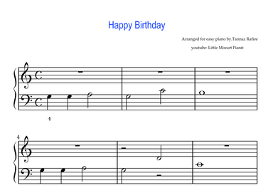 Easy Piano - Level 1 - Digital Download SKU: A0.1253172 By Tannaz Rafiee. By Patty Hill. Arranged by Tannaz Rafiee Fitzgibbon. Contest,Festival. Score. 1 pages. Tannaz Rafiee #846926. Published by Tannaz Rafiee (A0.1253172). This is the easiest version of happy birthday for the young beginners. This product was created by a member of ArrangeMe, Hal Leonard’s global self-publishing community of independent composers, arrangers, and songwriters. ArrangeMe allows for the publication of unique arrangements of both popular titles and original compositions from a wide variety of voices and backgrounds. About Digital Downloads Digital Downloads are downloadable sheet music files that can be viewed directly on your computer, tablet or mobile device. Once you download your digital sheet music, you can view and print it at home, school, or anywhere you want to make music, and you don’t have to be connected to the internet. Just purchase, download and play! PLEASE NOTE: Your Digital Download will have a watermark at the bottom of each page that will include your name, purchase date and number of copies purchased. You are only authorized to print the number of copies that you have purchased. You may not digitally distribute or print more copies than purchased for use (i.e., you may not print or digitally distribute individual copies to friends or students).