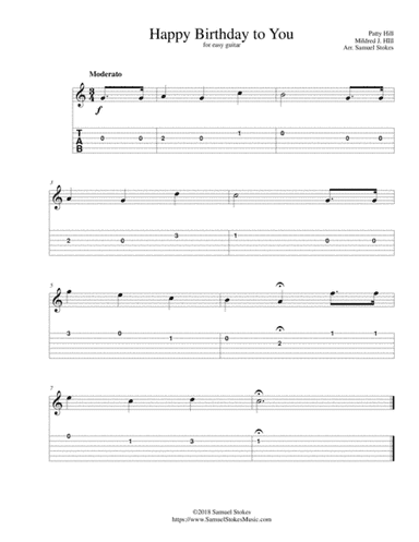 Guitar - Level 1 - Digital Download SKU: A0.561795 Composed by Patty Hill Mildred J. HIll. Arranged by Samuel Stokes. Children,Concert,Holiday,Instructional,Traditional. Guitar Tab. 1 pages. SamuelStokesMusic.com #4108007. Published by SamuelStokesMusic.com (A0.561795). This is an arrangement of "Happy Birthday to You" for easy guitar with TAB. Learn more about Samuel Stokes at https://www.SamuelStokesMusic.com This product was created by a member of ArrangeMe, Hal Leonard’s global self-publishing community of independent composers, arrangers, and songwriters. ArrangeMe allows for the publication of unique arrangements of both popular titles and original compositions from a wide variety of voices and backgrounds. About Digital Downloads Digital Downloads are downloadable sheet music files that can be viewed directly on your computer, tablet or mobile device. Once you download your digital sheet music, you can view and print it at home, school, or anywhere you want to make music, and you don’t have to be connected to the internet. Just purchase, download and play! PLEASE NOTE: Your Digital Download will have a watermark at the bottom of each page that will include your name, purchase date and number of copies purchased. You are only authorized to print the number of copies that you have purchased. You may not digitally distribute or print more copies than purchased for use (i.e., you may not print or digitally distribute individual copies to friends or students).