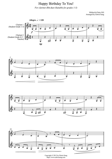 Clarinet Solo - Level 1 - Digital Download SKU: A0.731286 Composed by Mildred & Patty Hill. Arranged by Edwin Sung. Holiday,Instructional. Individual part. 2 pages. Edwin Sung #432257. Published by Edwin Sung (A0.731286). This duet piece emphasises on teamwork / co-operation, while not setting the bar too high for the players - music appreciation / enjoyment is what all musicians like! Melodies and harmonies do cross over occasionally to gain a balance of roles between the players. That's why this piece is recommended to everyone, ranging from beginners to advanced, to perform professionally or leisurely. Date published: 27th September, 2015. This product was created by a member of ArrangeMe, Hal Leonard’s global self-publishing community of independent composers, arrangers, and songwriters. ArrangeMe allows for the publication of unique arrangements of both popular titles and original compositions from a wide variety of voices and backgrounds. About Digital Downloads Digital Downloads are downloadable sheet music files that can be viewed directly on your computer, tablet or mobile device. Once you download your digital sheet music, you can view and print it at home, school, or anywhere you want to make music, and you don’t have to be connected to the internet. Just purchase, download and play! PLEASE NOTE: Your Digital Download will have a watermark at the bottom of each page that will include your name, purchase date and number of copies purchased. You are only authorized to print the number of copies that you have purchased. You may not digitally distribute or print more copies than purchased for use (i.e., you may not print or digitally distribute individual copies to friends or students).