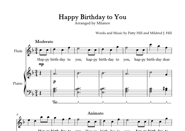 Happy Birthday to You in F Flute and Piano Lyrics Pedal (arr. Milanov)