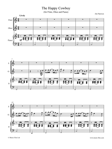 Instrumental Duet,Piano Flute,Instrumental Duet,Oboe,Piano - Level 3 - Digital Download SKU: A0.831254 Composed by Jim Paterson. Film/TV,Folk,World. Score and parts. 10 pages. Music Files Ltd #6318343. Published by Music Files Ltd (A0.831254). This arrangement of Happy Cowboy is for Flute, Oboe and Piano. Other arrangements are available. This product was created by a member of ArrangeMe, Hal Leonard's global self-publishing community of independent composers, arrangers, and songwriters. ArrangeMe allows for the publication of unique arrangements of popular titles and original compositions from a variety of voices and backgrounds. The length, difficulty, and retail pricing are determined solely by the discretion of the person who arranged or composed it. About Digital Downloads Digital Downloads are downloadable sheet music files that can be viewed directly on your computer, tablet or mobile device. Once you download your digital sheet music, you can view and print it at home, school, or anywhere you want to make music, and you don’t have to be connected to the internet. Just purchase, download and play! PLEASE NOTE: Your Digital Download will have a watermark at the bottom of each page that will include your name, purchase date and number of copies purchased. You are only authorized to print the number of copies that you have purchased. You may not digitally distribute or print more copies than purchased for use (i.e., you may not print or digitally distribute individual copies to friends or students).